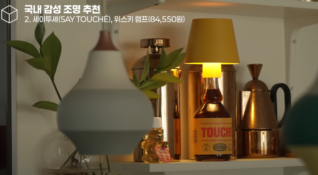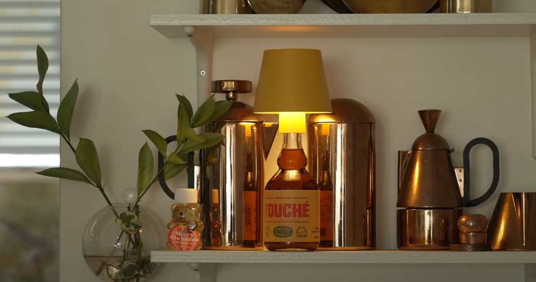 뮤지션 악뮤 이찬혁과 작가 임재린이 함께 만든 브랜드 쉐이투셰. 그 중 ‘위스키 램프’는 유리병 속 정화수와 갓이 결합된 기발한 디자인으로, 보는 사람마다 “이게 뭐야?” 반응이 나올 정도로 임팩트 있어요.