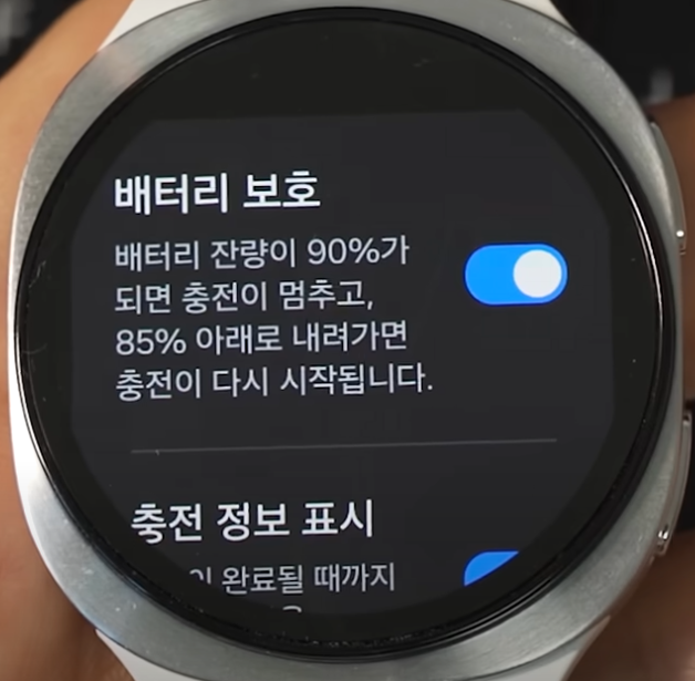 워치를 매일 100%까지 충전하면 배터리 수명이 빨리 줄어듭니다. 이를 막기 위해 배터리 보호 기능을 켜 두세요. 설정에서 이 기능을 활성화하면 자동으로 90%까지만 충전해 배터리의 화학적 스트레스를 줄여줍니다. 장기적으로 발열도 줄고 배터리도 오래 쓸 수 있는 필수 설정입니다.