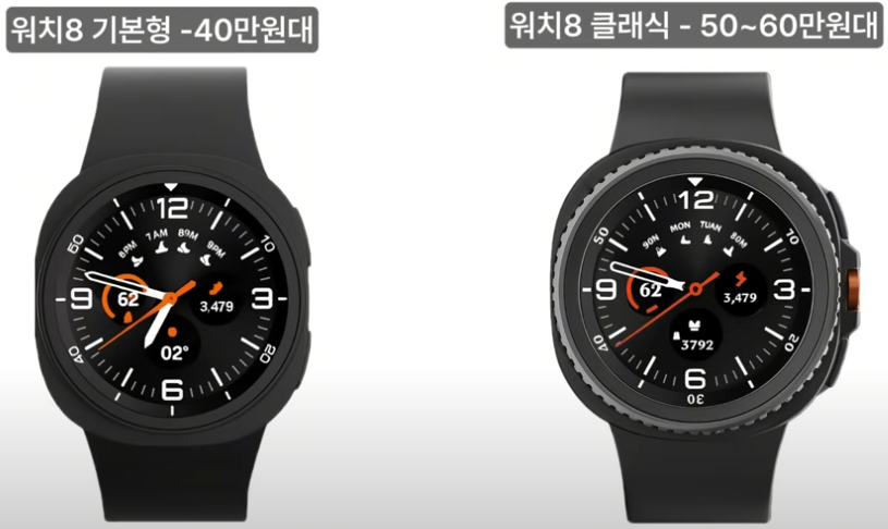 이번 워치8 시리즈의 예상 가격은 기본형은 40만 원대, 클래식 모델은 50~60만 원대로 예상됩니다. 울트라 모델과 비교하면 약간 더 합리적인 가격대라 접근하기 좋을 듯해요.