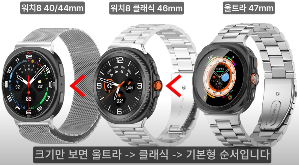 작년에 나온 울트라는 47mm였으니, 크기만 보면 울트라 > 클래식 > 기본형 순서라고 보면 될 것 같아요. 나에게 딱 맞는 사이즈 고르기가 조금 더 수월해졌네요!