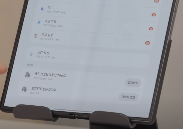 또 하나 인상적이었던 건 삼성헬스 연동이 더 강화됐다는 점이에요. 질병관리청, 건강보험공단 데이터까지 연동되니까 건강검진 기록이나 약 처방 이력을 한눈에 볼 수 있더라고요. 아이폰에는 없는 독보적인 기능이라 차별점이 확실합니다.