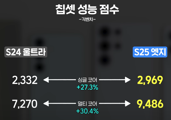 S25 엣지에도 최신 스냅드래곤 8 Gen 4 '엘리트' 칩셋이 적용됩니다. 성능 점수로만 보면 울트라보다는 살짝 낮지만, S24 울트라 대비 최대 30% 향상된 성능으로 기대해볼 만해요. 램은 12GB로 시리즈 다른 모델들과 동일합니다. 여러 앱을 동시에 돌리거나 고사양 게임, 영상 편집도 무리 없이 가능합니다. 삼성은 이번 S25 시리즈에 생성형 AI 기능을 대거 탑재했기 때문에, 이 AI들을 원활하게 구동하기 위한 사양 업그레이드가 적용된 거죠. 😊