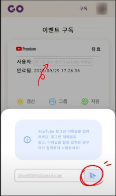 구매 후에는 구독 목록에 들어가서 '사용자 공란' 에 본인의 유튜브 가입 이메일을 입력합니다.