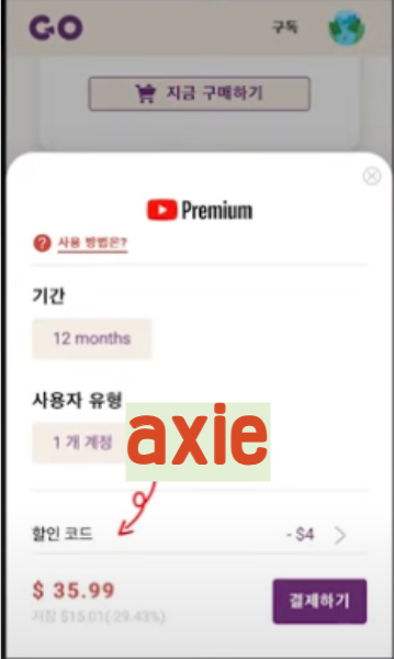 결제창에서 고잉버스 공식 할인코드 'axie'를 입력하면 10% 추가 할인 혜택을 받을 수 있어요.
