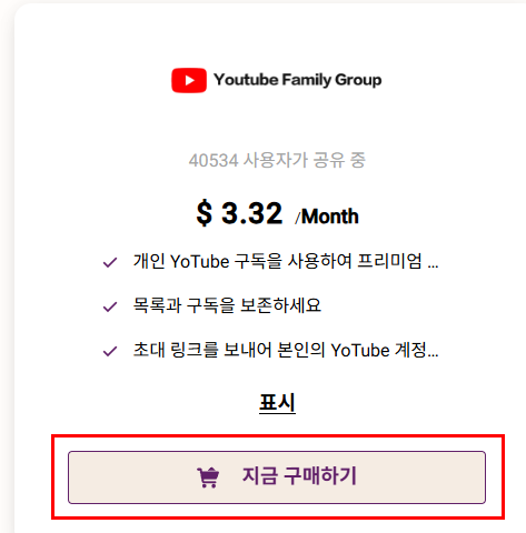 메인 화면에서 유튜브 프리미엄 항목을 찾아주세요. "지금 구매하기" 버튼 클릭!