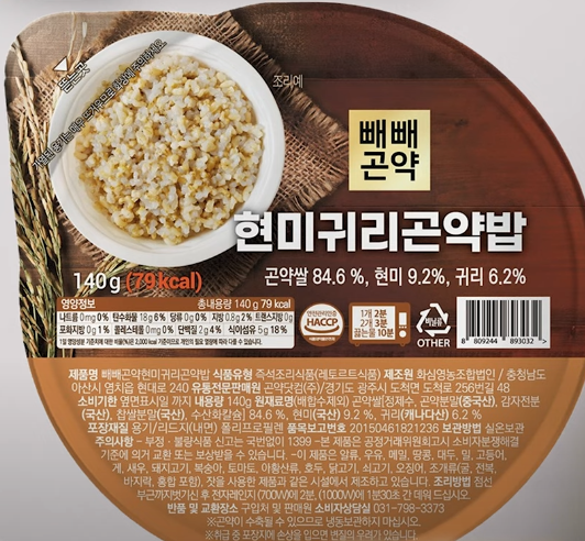 곤약 함량이 거의 90%에 가까운 제품이에요. 나머지는 현미로 채워져 있고 칼로리는 59kcal, 탄수화물은 10g 정도입니다. 실제로 먹어보면 밥 느낌보다는 곤약 식감이 훨씬 강해요. 포만감은 좋지만 밥 같은 식감을 기대한다면 조금 실망할 수도 있어요.