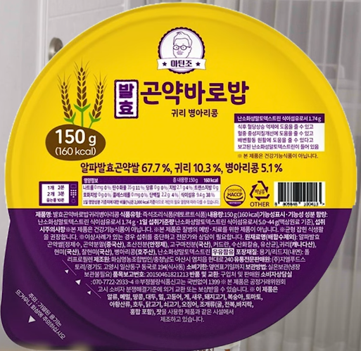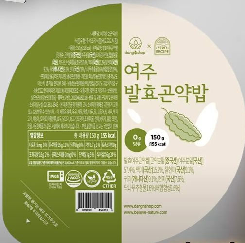혈당 관리에 관심 있으신 분들께 추천해요. 발효 여주 곤약쌀이라서 혈당 스파이크를 낮추는 데 도움을 준다고 알려져 있어요. 곤약 함량은 57% 정도로 밥 식감도 어느 정도 느껴지고 칼로리는 155kcal, 탄수화물은 29g 정도 됩니다.