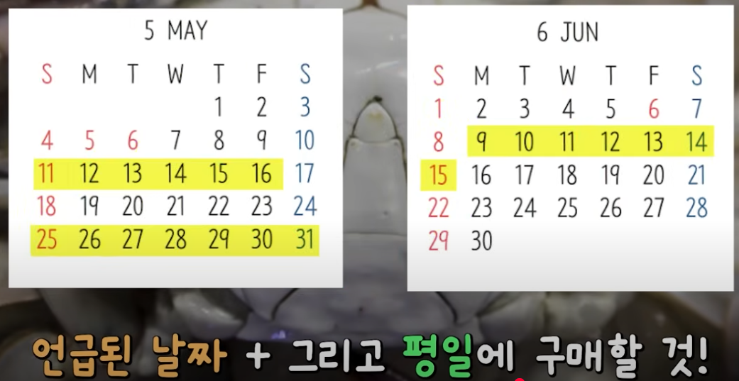 꽃게를 살 때는 시기와 조건을 잘 맞추는 것이 중요합니다. 보통 주말보다는 평일이 가격이 낮습니다. 또 하나 중요한 포인트는 바로 물때인데요. 꽃게는 사리물때 조업량이 많습니다. 조수간만의 차가 커서 꽃게 이동이 활발해지고, 그물에 더 많이 걸리기 때문이죠. 달력을 보고 보름달이나 그믐달 무렵, 즉 사리물때를 노리면 물량이 많아 가격도 조금 내려갑니다.