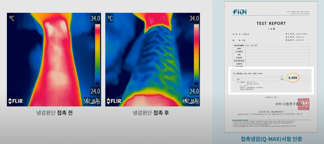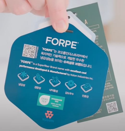 가장 먼저 볼 것은 어떤 냉감 소재를 썼는지예요. 대표적인 원사는 코오롱 ‘포르페’와 휴비스 ‘듀라론’인데, 이 두 가지는 안정성과 냉감 효과 모두에서 검증된 소재입니다. 특히 포르페는 단가가 높고, 수축과 보풀 방지 성능도 뛰어나 고급 라인에 주로 사용돼요.