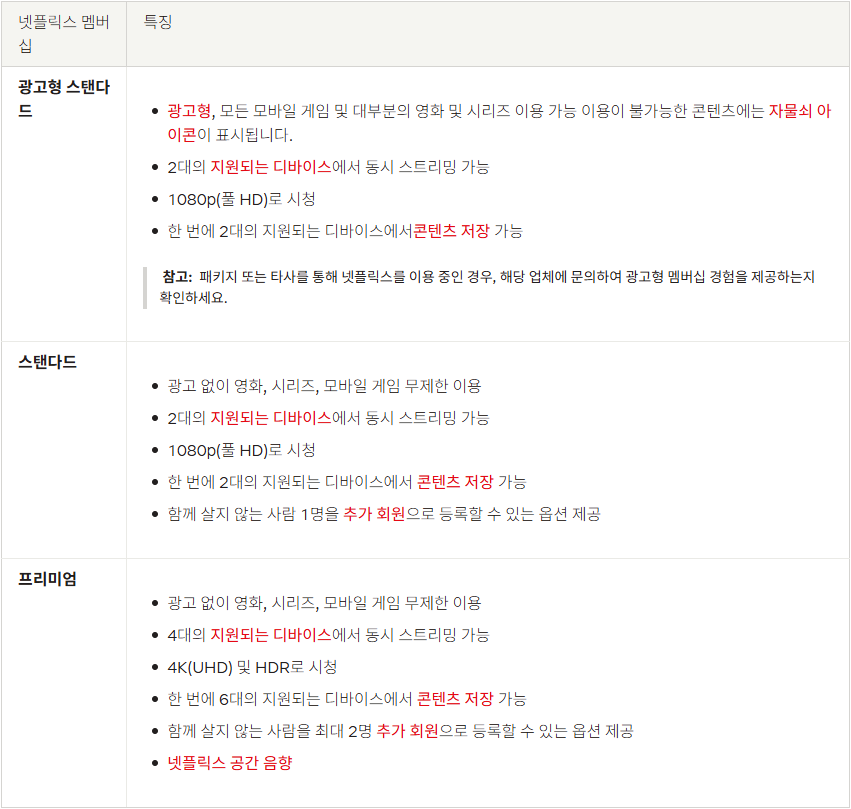 요즘 OTT 서비스 요금이 점점 올라서 부담되신 분들 많으시죠? 넷플릭스는 요금제가 세분화되어 있는데요, 가장 저렴한 요금제는 월 7,000원, 광고가 포함되고 화질은 Full HD(프레치드)까지만 지원돼요. 광고 없는 스탠다드는 월 13,500원, 프리미엄은 월 17,000원으로 꽤 부담스럽습니다.