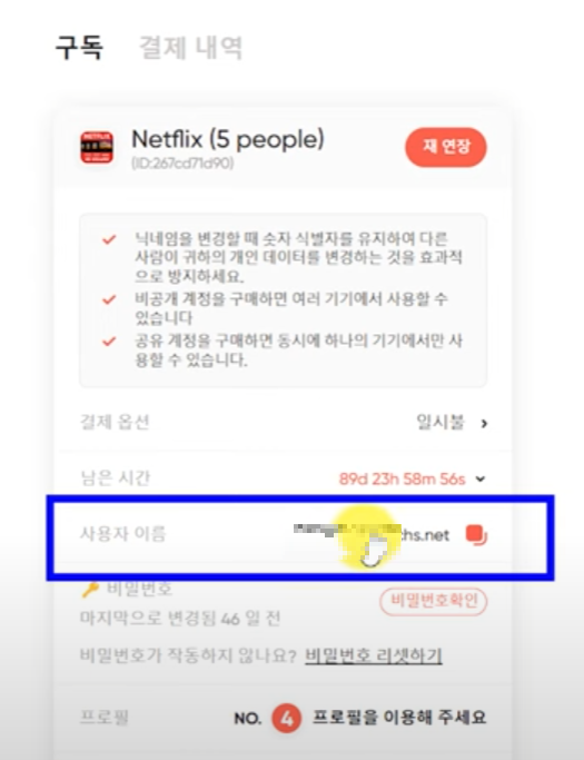 2. 구매한 넷플릭스 상품이 보이면, 사용자 이름과 비밀번호를 확인할 수 있어요.