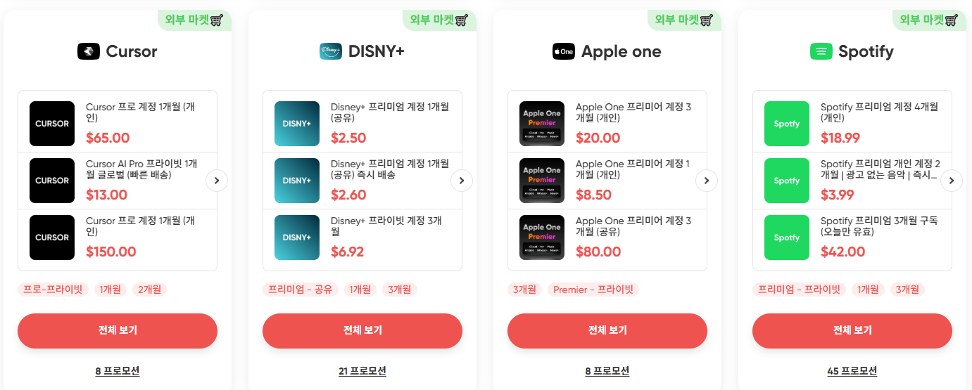 마켓플레이스에서는 판매자들이 직접 올린 계정 상품이 쭉 나오는데, 여기에서는 넷플릭스 외에도 Prime Video, Gemini, Cloud 등 생각보다 훨씬 저렴한 상품이 많았습니다.