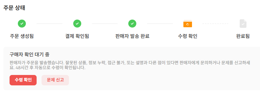 판매자가 발송을 완료했고, 수령 확인을 눌러주면 최종 완료 단계로 갈 수 있습니다.