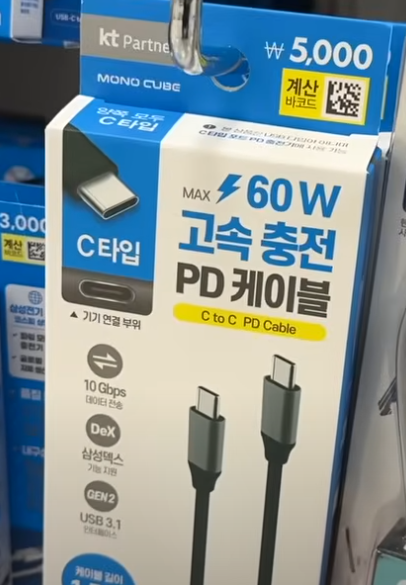 - 케이블 (파일 전송 포함): 5천 원짜리 60W 고속 충전 PD 케이블