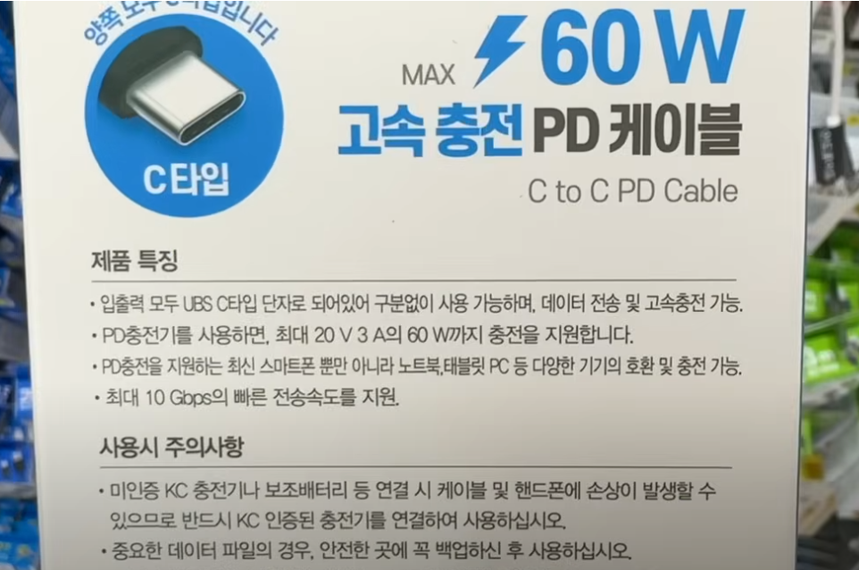 다이소 충전 케이블 코너에 가면 3천 원짜리 C to C 케이블과 5천 원짜리 PD 지원 케이블이 눈에 띄어요. 둘 다 최대 출력 60W를 지원해서 충전 속도는 비슷한데, 큰 차이는 데이터 전송 속도에 있습니다.