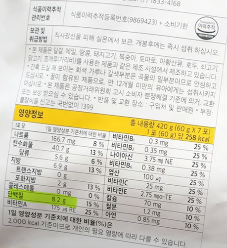다만 단백질 함량이 8.2g으로 좀 낮은 편이라서, 저처럼 단백질을 많이 챙겨야 하는 분이라면 하루 섭취량을 맞추려면 다른 식품과 함께 드시는 걸 추천해요.
