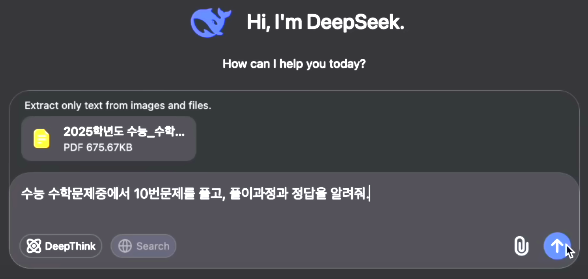 - 딥시크는 이미지를 업로드한 후 수학 문제를 푸는 과정에서 명확한 풀이 과정과 정답을 제공했습니다.