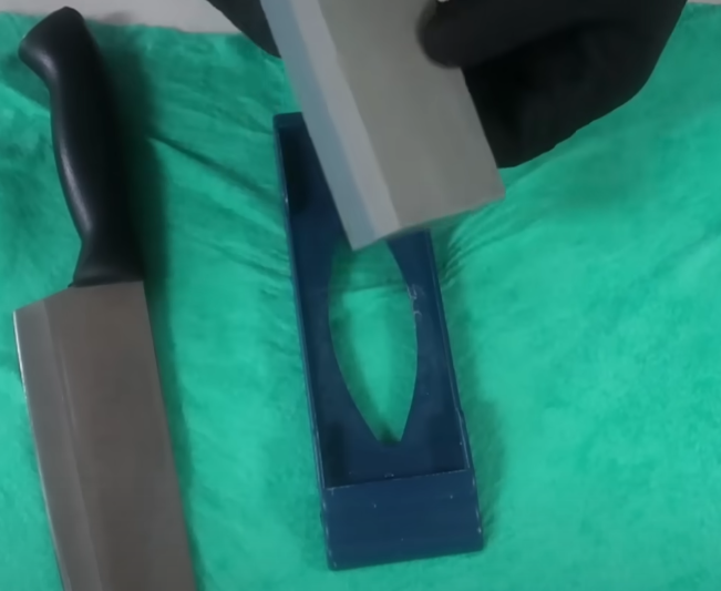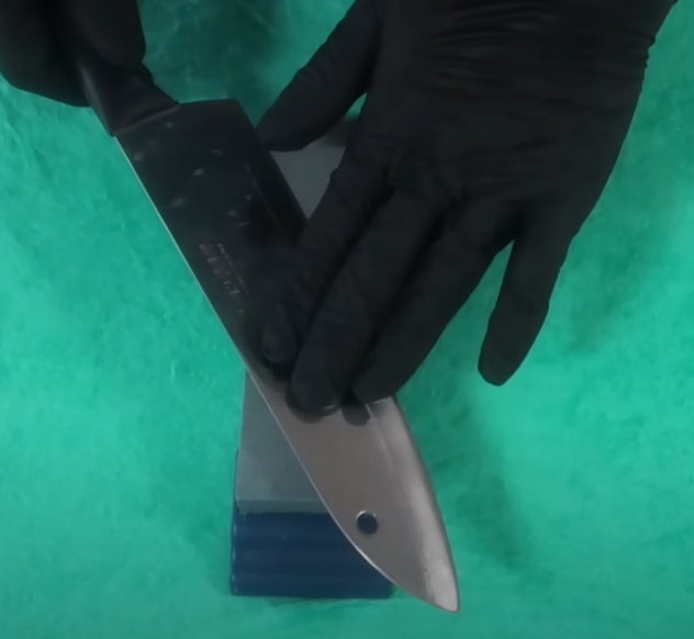 처음엔 180방 거친 숫돌로 한쪽 면을 50번 정도 당겨주고, 반대쪽도 같은 방법으로 50번 갈아주세요. 특히 칼 앞부분은 사용이 많으니 좀 더 집중적으로 갈아주는 게 좋습니다.