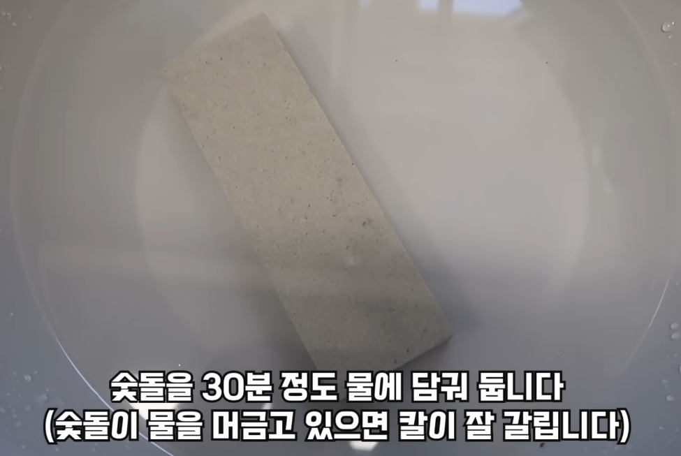 사용 전에는 숫돌을 잠깐 물에 적셔주세요. 이렇게 하면 칼날이 숫돌에 더 잘 밀착돼서 날이 골고루 살아납니다.