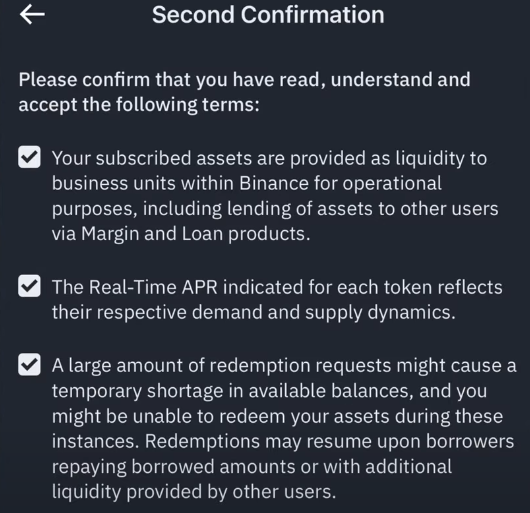 스테이킹 전 몇 가지 조건을 확인해야 합니다. 자산이 바이낸스 운영 목적으로 사용될 수 있다는 점과 수요/공급에 따라 이율이 변동될 수 있다는 점을 꼭 읽고 동의해 주세요.