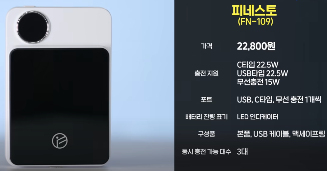 저렴한 가격에 LED 디스플레이까지 탑재된 피네스토. 맥세이프 링까지 포함되어 있어서, 맥세이프 미지원 기기도 붙여서 쓸 수 있어요. 무선 충전까지 포함해 최대 3대 동시 충전 가능하다는 점도 매력적입니다.