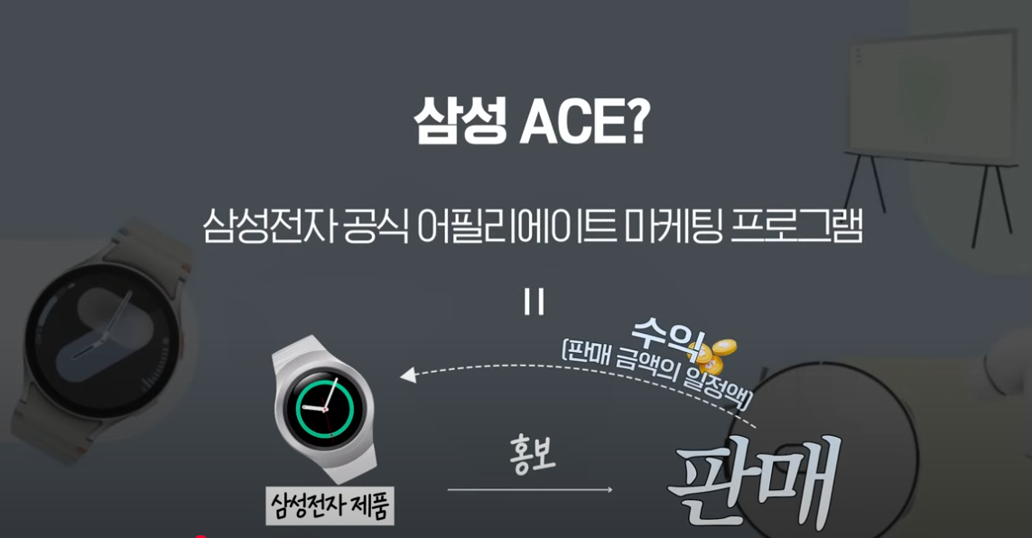 삼성 ACE는 삼성전자 제품을 홍보하고 판매가 발생하면 판매 금액의 3% 수수료를 받는 어필리에이트 마케팅 프로그램이에요. 전자제품은 단가가 높아서 한 번 판매되면 수수료도 제법 쏠쏠하답니다!