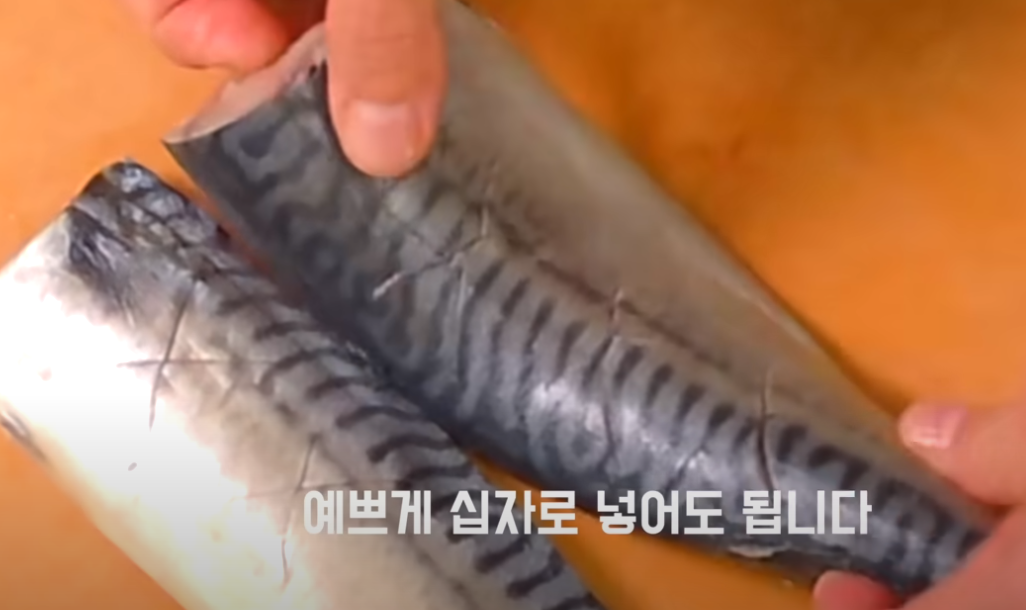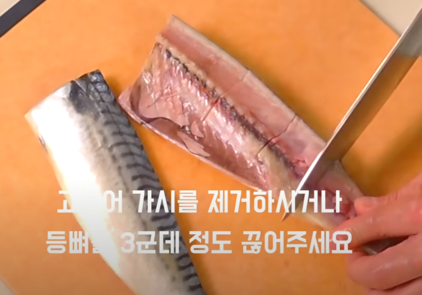 먼저 고등어는 노르웨이산을 추천드려요. 고소하고 기름기도 적당하거든요. 손질할 때는 꽁지 부분 잘라주시고, 반으로 잘라서 척추를 톡톡 끊어주세요. 가시까지 완벽히 제거할 필요는 없지만, 중심 뼈만 톡 끊어주면 먹기도 수월해요.