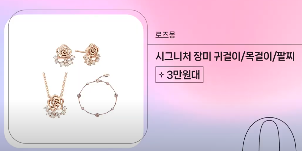 성년의 날 선물로 빠지지 않는 게 바로 장미꽃인데요, 생화는 시들지만 이건 시간이 흘러도 남습니다. 로즈몽의 장미 시리즈는 귀걸이, 목걸이, 팔찌 중 선택 가능한 고급 악세사리예요.