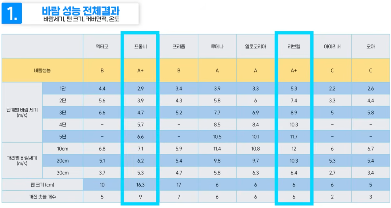 | 바람 성능 최강 | 리브엘, 프롬비 | 단계별·거리별 바람 세기 모두 우수, 강한 풍속 |