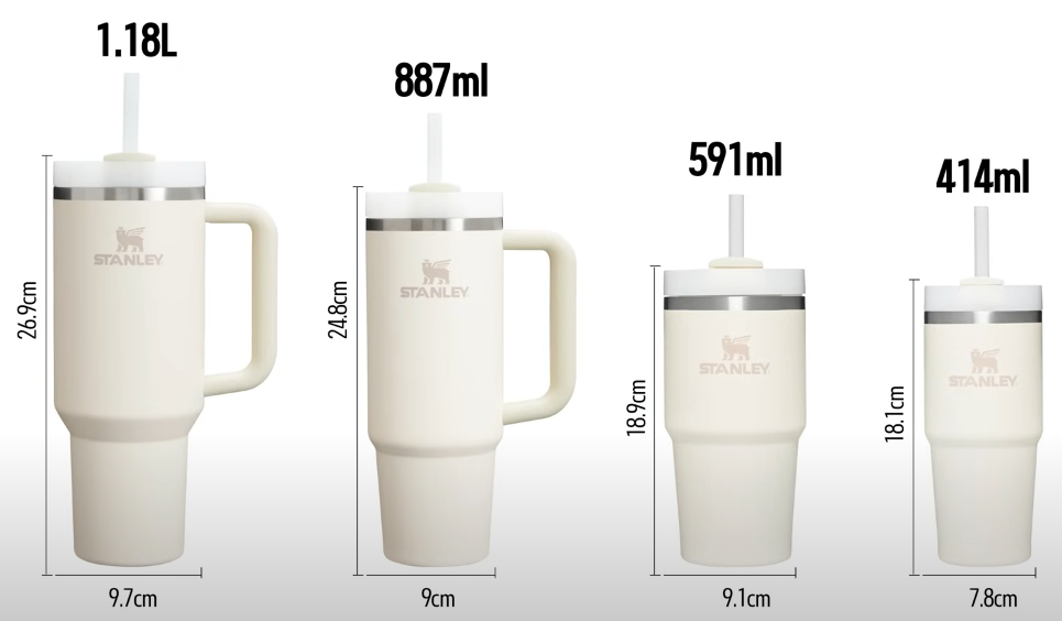 가장 먼저 소개할 제품은 퀜처 텀블러예요. 스탠리 라인업 중에서도 가장 핫한 제품이고, 출시될 때마다 품절 대란이 일어날 정도로 인기 있는 모델이죠. 퀜처는 4가지 사이즈(414ml, 591ml, 887ml, 1.18L)가 있지만, 그중에서도 887ml와 1.18L 모델이 가장 많이 찾는 사이즈예요.