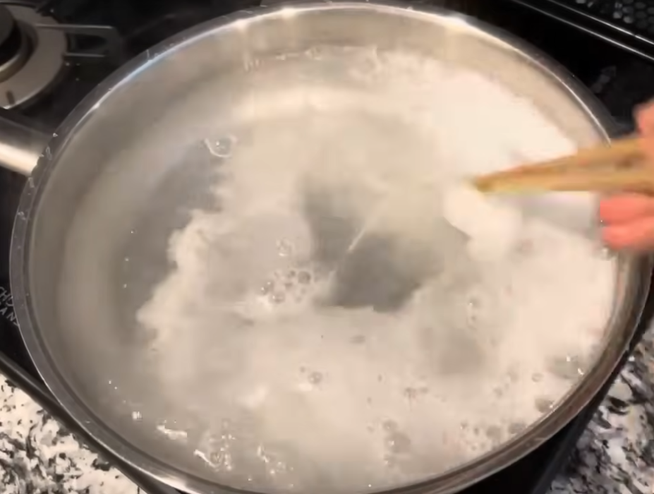 냄비에 물을 붓고 끓인 뒤 베이킹 파우더를 넣고 잘 저어줬어요. 그 상태로 15분 정도 담궈 뒀는데요.