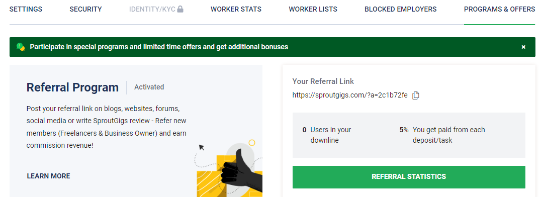 마지막으로 추천인 제도 입니다. 본인이 제공한 링크로 친구가 가입할 시 친구가 업무를 완료할 때마다 여러분은 5%의 포인트를 얻게 됩니다. 여러분의 추천인 링크는 웹페이지 상단에 보시면 api 옆 Refer a friend 메뉴로 들어가셔서 아래 그림처럼 Your Referral Link를 복사하셔서 추천하시면 됩니다. 앞서 소개해 드렸던 웹 사이트 주소는 저의 추천인 주소로 바로 들어가는 것이니 혹시 원치 않으신다면 다른 친구 추천 주소로 들어가셔서 가입하시면 됩니다.