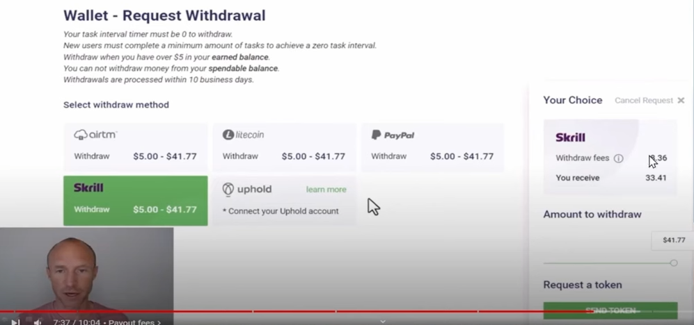 다른 유투버 화면을 잠시 보시면 인출은 가상화폐인 라이트코인 또는 페이팔 등 여러 온라인 대금 수취 서비들이 있습니다. 우리가 가장 많은 페이팔을 이용하는게 좋을 것 같고 인출을 눌렀을 경우에 일정 수수료를 떼고 여러분의 연결된 계정으로 보내줍니다.