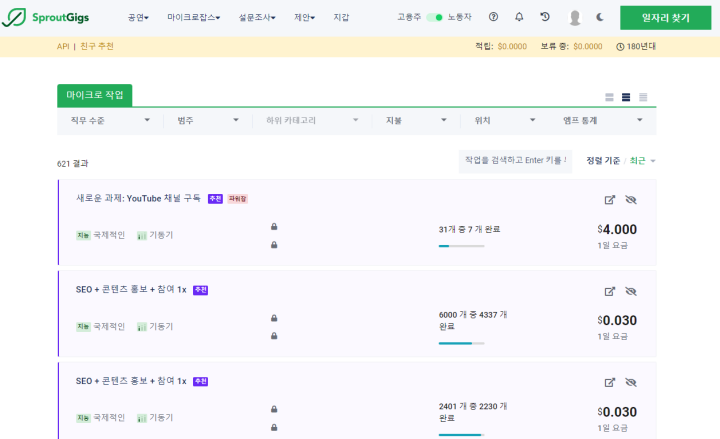 일자리 찾기로 들어가 보시면 이렇게 여러분이 가능한 부업이 리스트로 보여줍니다. 유튜브 채널 구독하면 4$를 벌 수 있는 일도 보이는군요. 그 일의 경우 31개 중 7개 완료로 표시되어 있는데 이 말은 총 업무가 31번 가능한데 수행한 사람이 7번이고 31번이 도달하면 더 이상 이 일을 할 수가 없게 됩니다. 일단 일을 시작해봅니다.