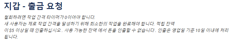 상단 Wallet 메뉴로 들어가시면 Request Withdrawal 찾을 수 있습니다. 아마 여러분들은 아직 5$ 안되었기 때문에 아직 인출을 안될 것 입니다.