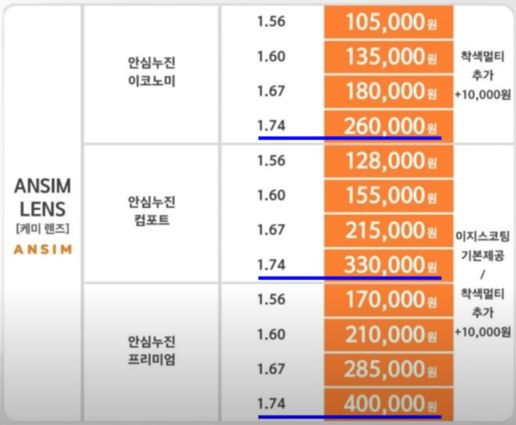 | 브랜드 안경테 | 100,000원 | 200,000원 | 400,000원 |