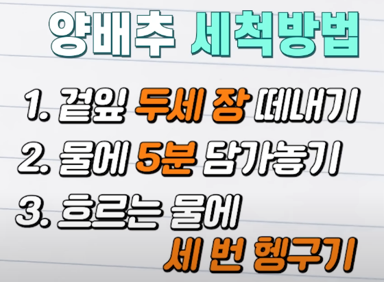 양배추 세척은 양파를 씻는 것처럼 생각하시면 됩니다. 겉잎 두세 장만 떼고, 통째로 물에 5분 정도 담근 뒤 흐르는 물에 가볍게 세 번만 헹궈주세요. 이렇게만 해도 충분합니다.