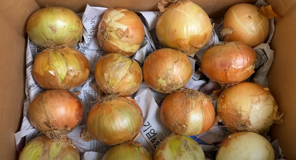 만약 망이 없다면 박스에 신문지를 깔고 양파를 담아주세요. 신문지는 습기를 잡아주어 양파가 덜 상합니다.
