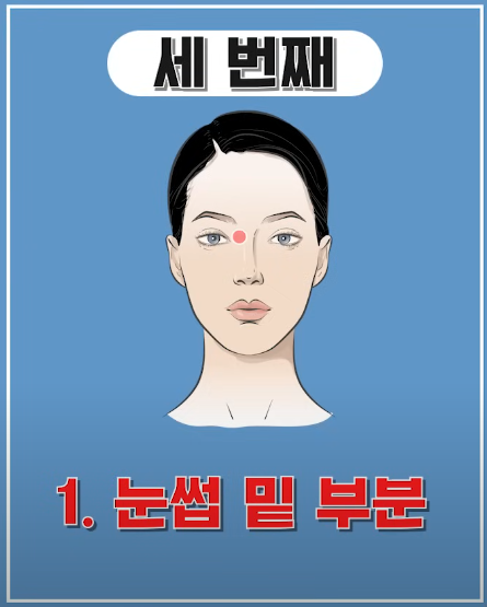 마지막은 눈썹 밑과 헤어라인 꼬집기입니다. 눈썹 바로 아래 뼈 있는 부분을 엄지와 검지로 살짝 눌러주고, 이마 헤어라인 쪽도 같은 방법으로 꼬집어주세요. 이 부위는 혈점 자극이 되면서 이마 부기와 눈가 부종까지 정리해줍니다. 꼬집은 뒤엔 손가락으로 가볍게 원을 그리듯 마사지해주면 더 좋아요. 5~10회 반복해 보세요.