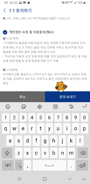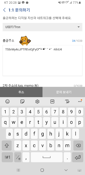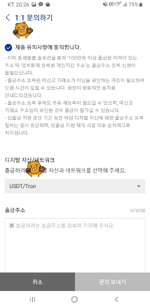 - 모든 정보를 확인한 후 ‘문의 보내기’를 눌러 출금주소 등록 신청을 완료합니다.