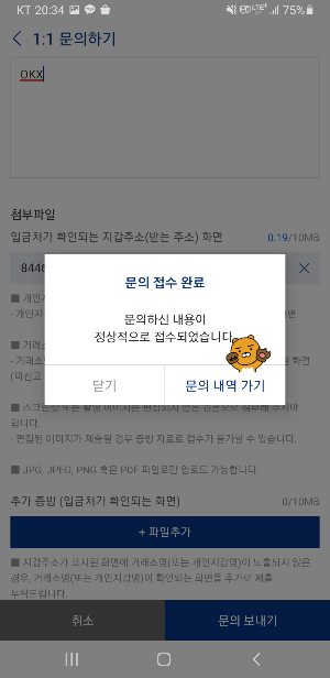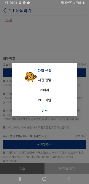 - 업비트 문의 등록 페이지에서 파일 추가 버튼을 눌러 캡처한 이미지를 첨부합니다.