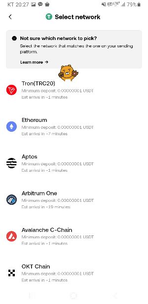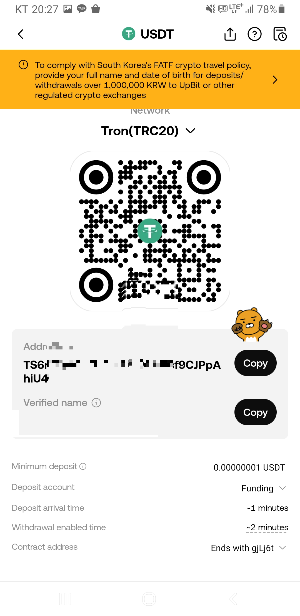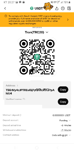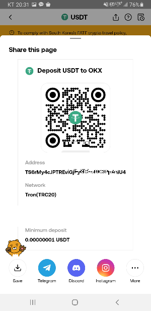- OKX 앱에서 ‘디파짓 크립토’ → ‘USDT’ → ‘Tron(TRC20)’을 선택합니다.