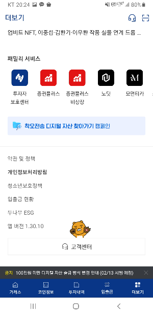 - 업비트 앱을 실행한 후, 우측 하단에 있는 ‘더보기’ 버튼을 클릭합니다.