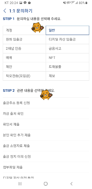 - ‘1:1 문의하기’ → ‘일반’ → ‘출금주소 등록 신청’을 선택합니다.