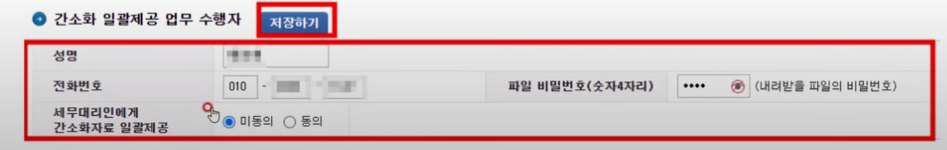 간소화 일괄제공 업무 수행자 부분을 입력, 비밀번호 입력, 세무 대리인이 잇는 경우는 동의 후 저장을 해줍니다.