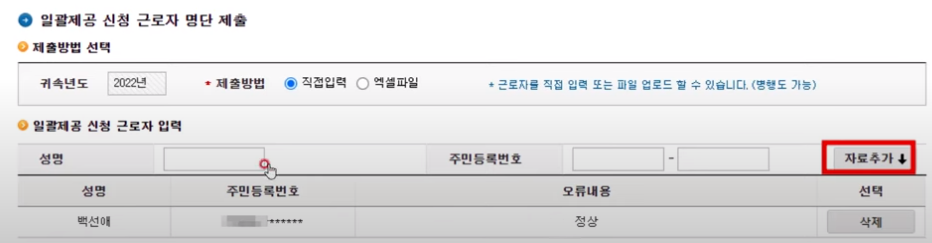일괄제공 신청 근로자가 많은 경우 엑셀에 정리하여 자료추가를 해 주시면 됩니다. 최종 완료 후 근로자 명단 제출을 클릭하여 주십시오.