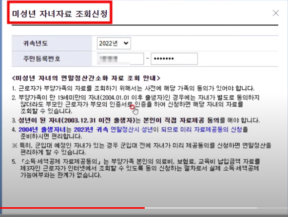 만 19세 미만의 자녀가 있을 경우 미성년 자녀 자료 조회 신청 하시고 귀속년도, 주민등록번호 입력 후 신청해 주시면 됩니다.