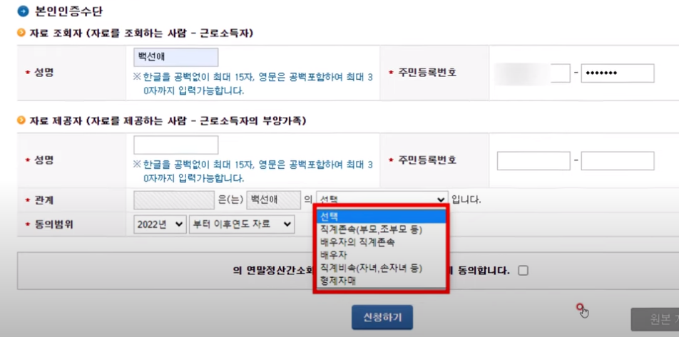 아래 제공자에서 자료 조회자는 나로 조회 되고, 자료 제공자의 경우 남편, 아내, 자녀의 성명과 주민번호 입력한 후 관계까지 선택해 주시면 됩니다. 그 후 동의 범위는 2022년부터 이후 연도 자료 선택한 후에 신청 눌러주시면 됩니다.