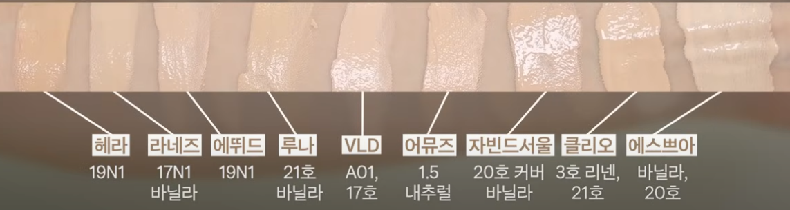 - 색상 밝기 기준: 라네즈 > 에스쁘아 > VDL ≒ 어뮤즈 > 자빈드서울 > 루나 > 에뛰드 > 헤라 순으로 보면 돼요.