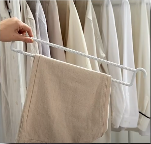 이 제품은 특히 바지 정리에 불편함을 느꼈던 분들께 강력 추천해요. 상단에는 일반 옷을, 하단에는 바지걸이에 바지를 걸 수 있도록 설계되어 있어요. 바지걸이 하나에 두 벌씩 수납 가능하고, 미끄럼 방지 처리가 되어 있어서 바지가 흘러내리거나 구겨질 걱정이 없어요.
